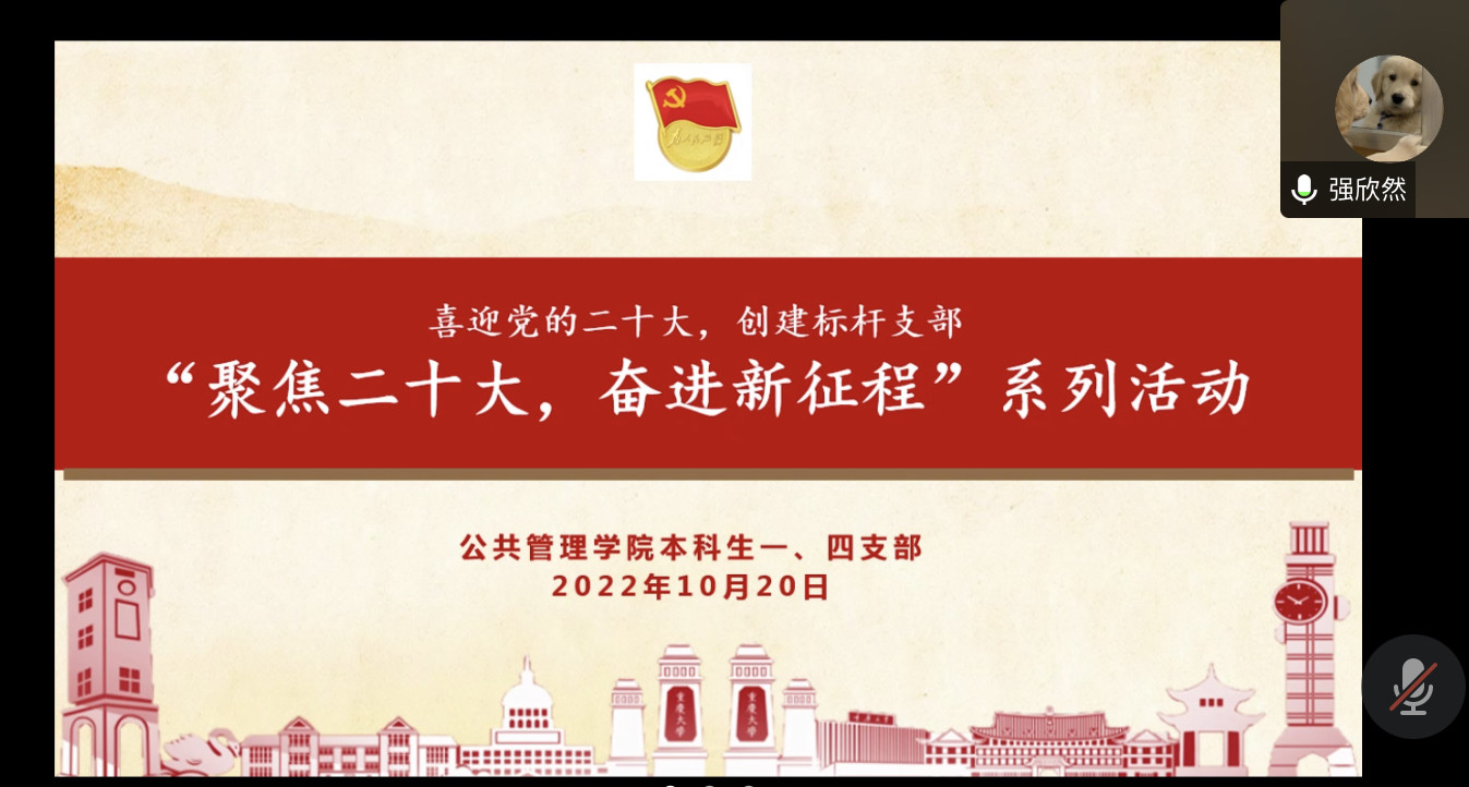 2022-10-272022年10月16日至22日,中国共产党第二十次全国代表大会在北京隆重召开。大会是在全党全国各族人民迈上全面建设社会主义现代化国家新征程、向第二个百年奋斗目标进军的关键时刻召开的一次十分重要的大会。2022年10月26日晚19点30分,公共管理学院本科生二、五支部在线上开展了“强国复兴有我——学习宣传党的二十大精神”主题活动。此次活动由本科生二支部书记徐柳老师主持,本科2021级全体入党积极分子也积极参会。活动内容包...