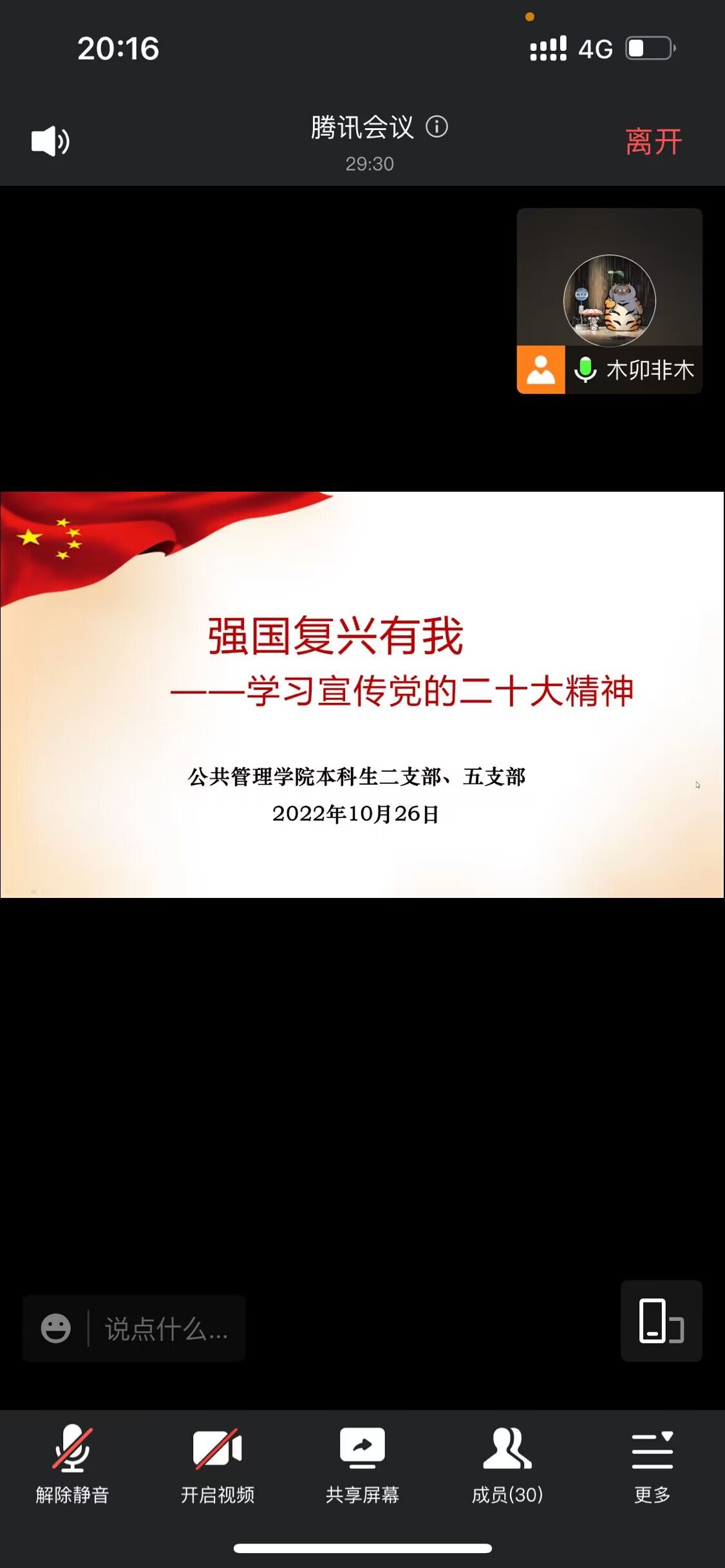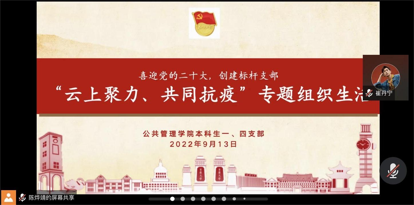 2022-09-28新学期伊始,疫情阻挡了大家返校的步伐,但无数逆行者冲锋在前,为早日返校、战胜疫情默默奉献。在返校之际,公共管理学院本科生一、四支部于2022年9月13日下午3时在线上开展了“喜迎党的二十大,创建标杆支部”主题教育系列活动之“云上聚力,共同抗疫”专题活动。公共管理学院本科生一、四支部全体党员参会。此次活动分为视频学习、抗疫精神、手写祝福、交流分享四个部分。首先,在视频学习部分,由主持人陈烨靖同志带领大家...