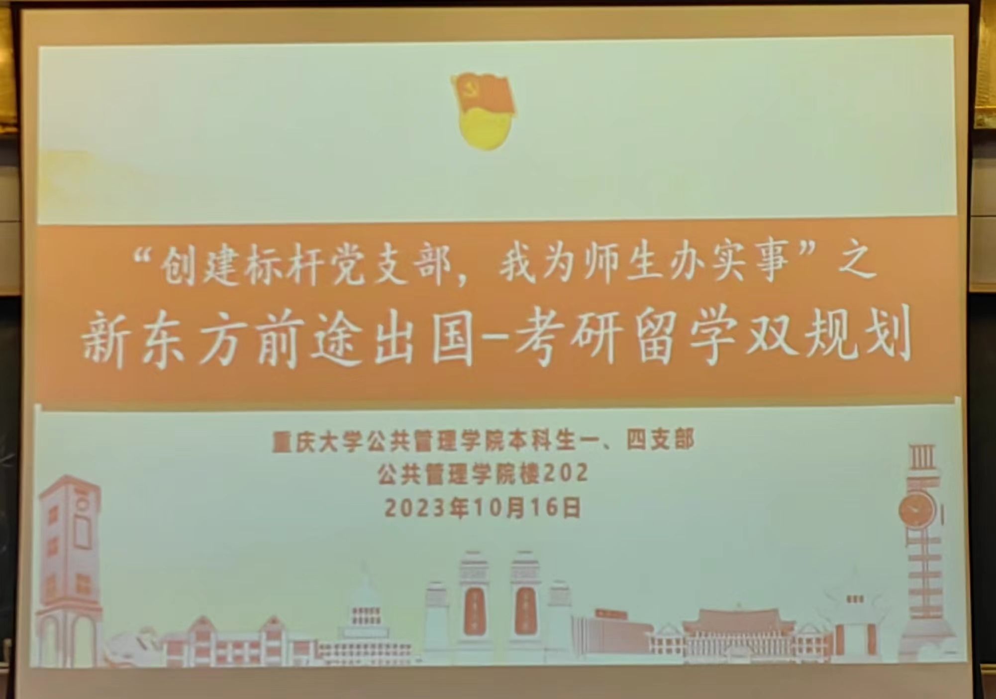 2023-10-18“创建标杆党支部,我为师生办实事”,是学院本科生一四支部的优良传统,2023年10月16日下午3:00,为了给同学们提供最有效的学业帮助并规划未来发展方向,在一支部书记王丽娟的组织下,公共管理学院2022级本科生一、四支部全体党员、入党积极分子、青年团员在学院202多功能会议厅参与了出国、保研、考研介绍答疑解惑交流活动。首先,由公共管理学院一支部书记王丽娟同志做简要开场,告知同学们依据往年考研升学等经验,从大二...