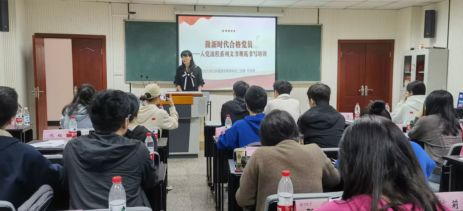 2023-11-10学生党员发展是高校基层党组织的一项重要工作,关系党员质量,关系党的先进性,关系中国特色社会主义事业是否后继有人。为认真落实学校党委组织部、学院党委关于本学期入党积极分子和发展对象培养的工作要求,2023年10月24日下午17点,公共管理学院本科生二、五支部组织全体学生党员、入党积极分子和发展对象开展了“做新时代合格党员——入党系列文书规范书写”专题培训。培训会上,本科生二支部支部书记徐柳老师按照入党流程...