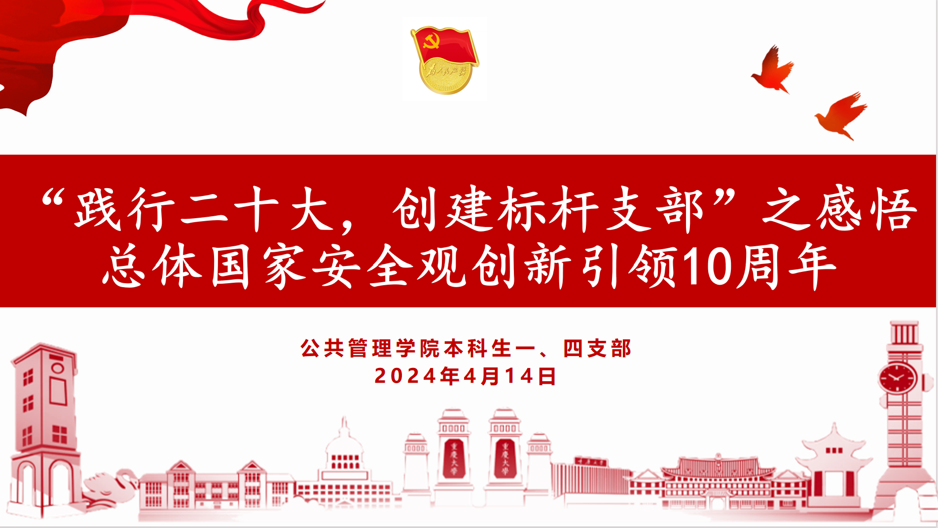 2024-04-19国家安全是国家发展的最重要基石、人民福祉的最根本保障。今年4月15日,是总体国家安全观提出10周年,我们将迎来第9个“全民国家安全教育日”。2024年4月14日晚8:00,为更加深对总体国家安全观的领悟,在学院本科生一支部书记王丽娟同志的牵头下,学院本科生一、四支部的全体党员、入党积极分子、青年团员积极参与了“践行党的二十大,创建标杆支部”之“感悟总体国家安全观创新引领10周年”线上活动。活动由本科生一支部组...