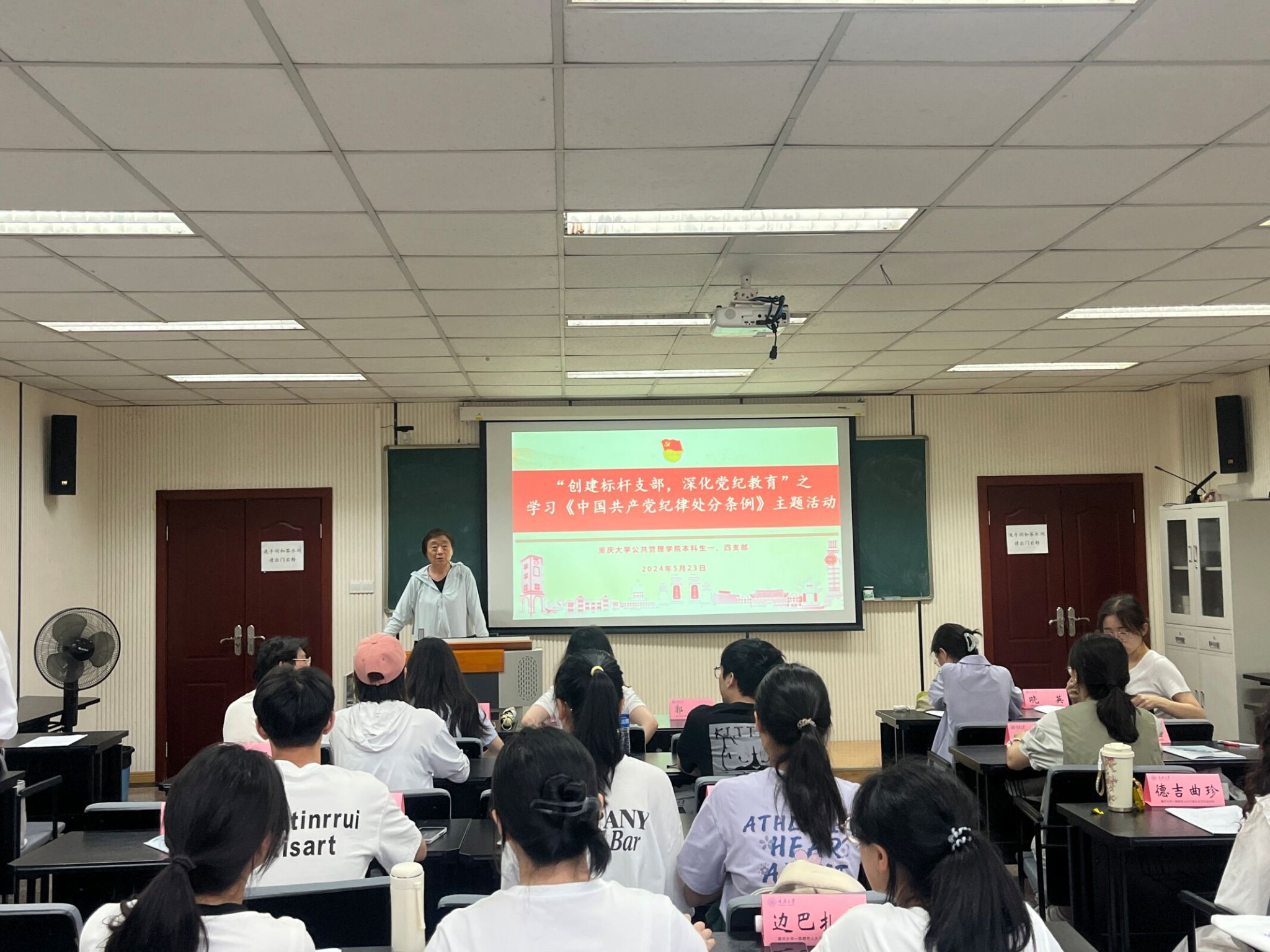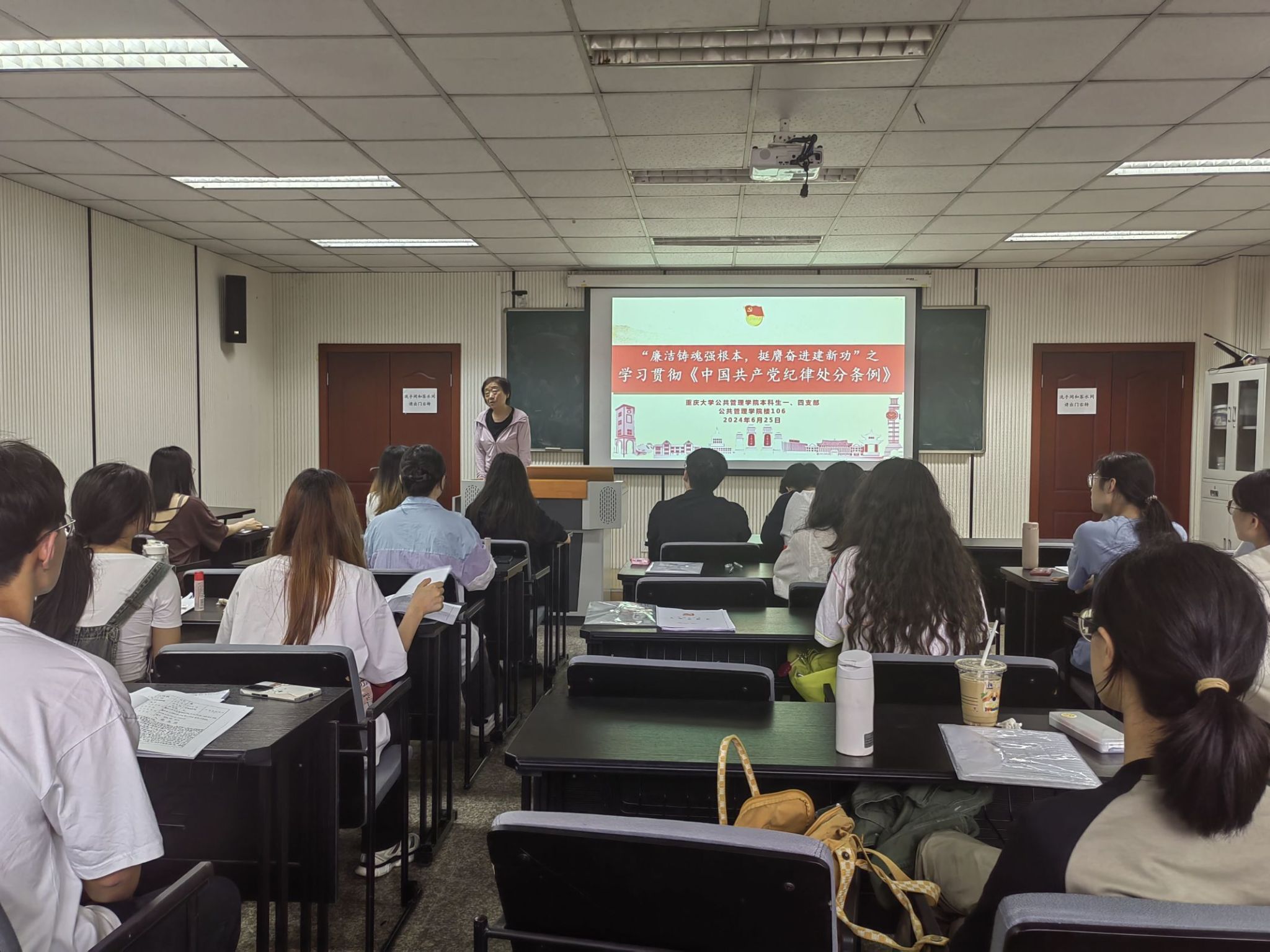 2024-06-26为了进一步深化对加强党的纪律建设重要性的认识,最终做到学纪、知纪、明纪、守纪四个方面。2024年6月25日14:30,在本科生一支部书记王丽娟、四支部书记袁凤的组织下,公共管理学院本科生一、四支部全体党员和入党积极分子们在学院楼106会议室积极参与了“廉洁铸魂强根本,挺膺奋进建新功”之学习贯彻《中国共产党纪律处分条例》主题活动。此次活动由本科生四支部宣传委员付薇主讲,从党纪修订背景、案例警告和新修订的《条例...
