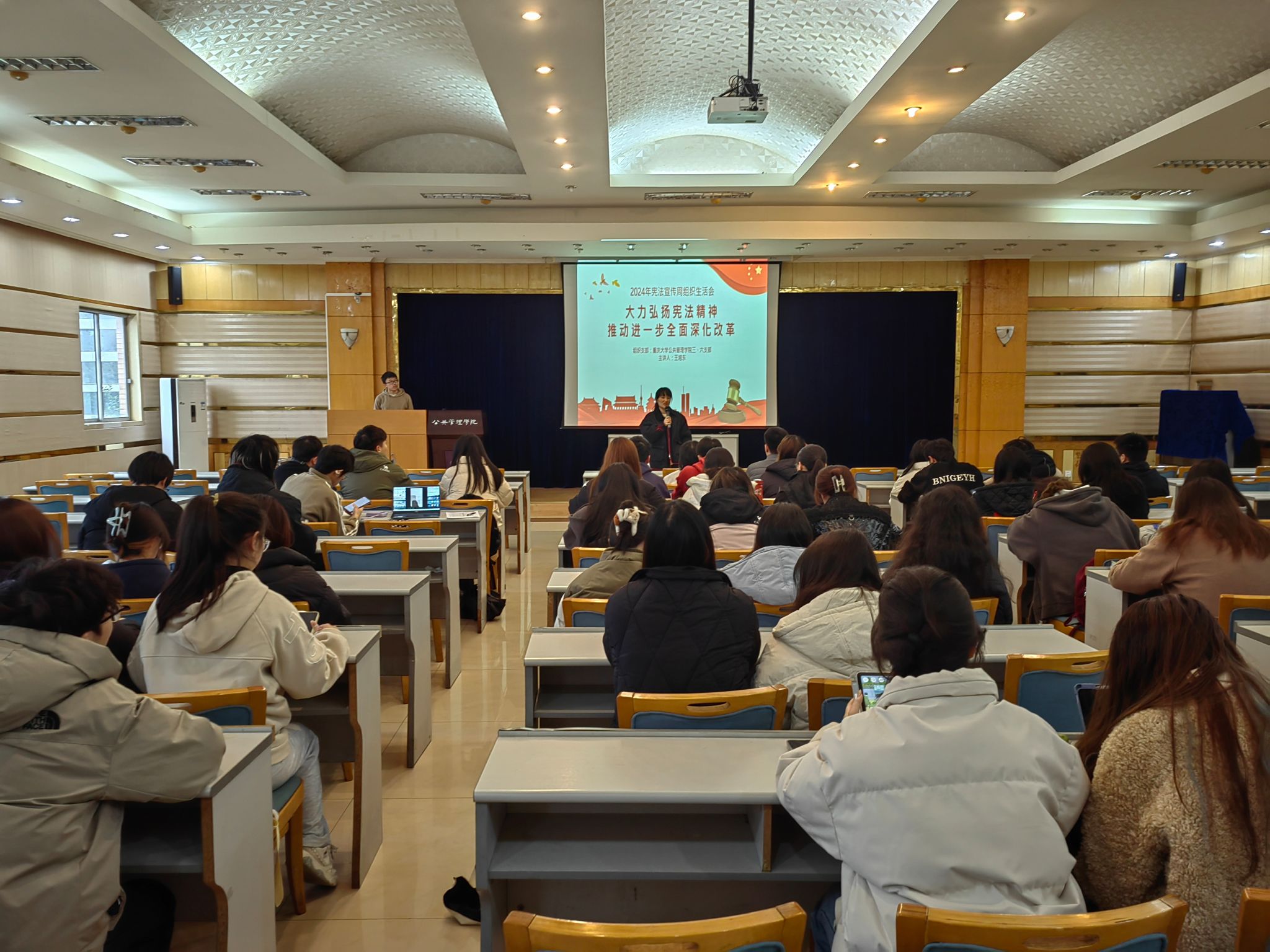2024-12-142024年12月4日是我国第11个“国家宪法日”,为全面贯彻党的二十大和二十届三中全会精神,深入学习习近平法治思想和习近平总书记关于宪法的重要论述,不断提升青年学生的法治素养、理论水平,2024年12月5日下午15点,公共管理学院本科生三、六支部在学院楼202会议厅联合开展了以“大力弘扬宪法精神,推动全面深化改革”为主题的党日活动。2023级本科生辅导员徐柳、全体学生党员及入党积极分子到场参加活动。首先,本科生六支部入...