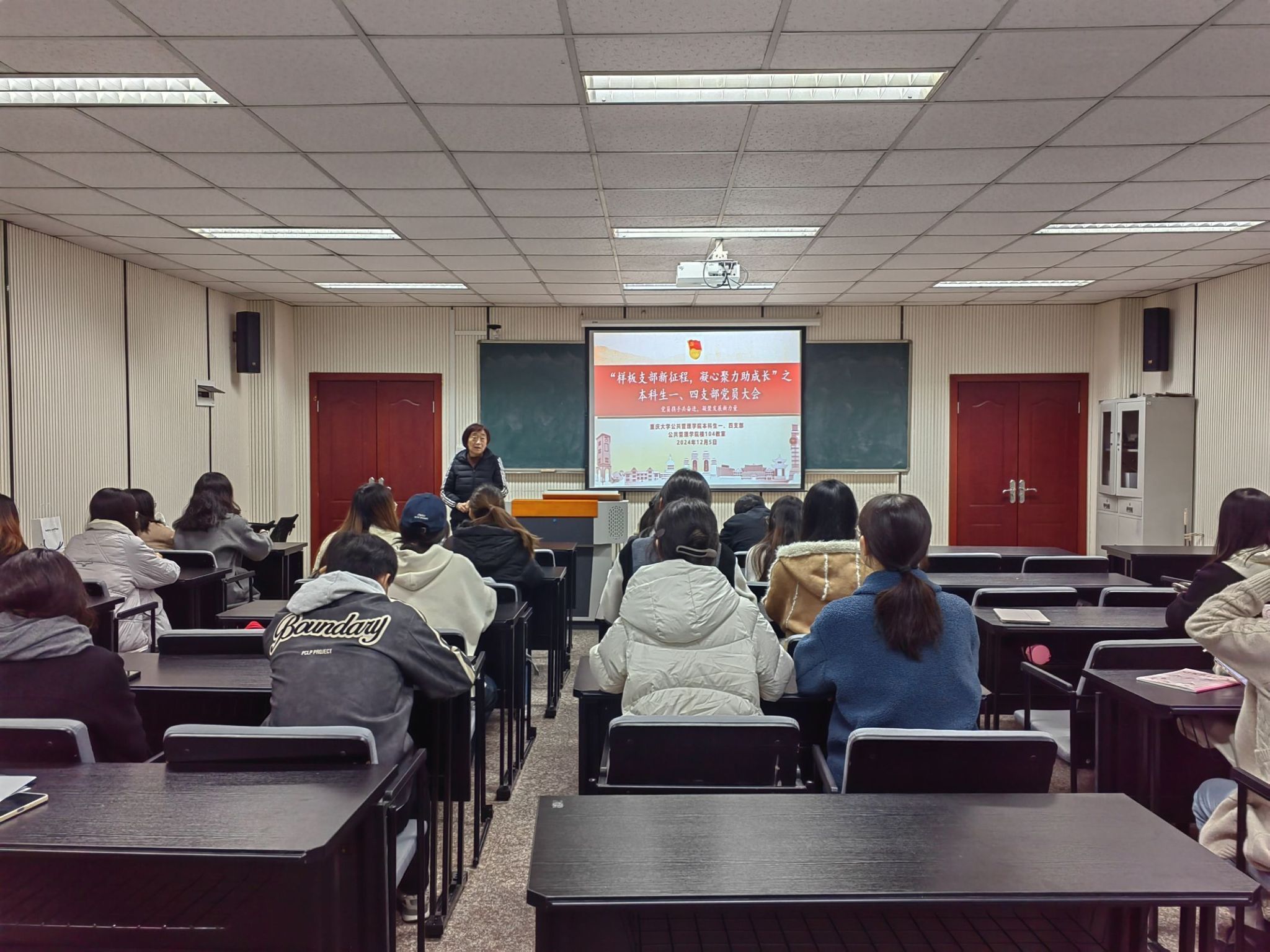 2024-12-09为响应党的号召,为党储备后备力量,2024年12月5日15:00, 本科生一支部在学院楼104教室召开“样板支部新征程 凝心聚力助成长”之吸纳接收新党员大会,讨论决定邓彤同志等6名发展对象的预备党员接收事宜,参会成员有一支部书记王丽娟、组织委员赵文龙、宣传委员陈嘉怡以及本科生一支部全体党员。12月5日15:00,本科生四支部在学院楼106教室召开“样板支部新征程 凝心聚力助成长”之吸纳接收新党员大会,大会讨论决定了冉晨雨同...
