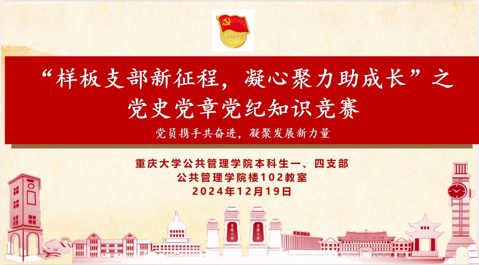 2024-12-25为深化党史、党章、党纪的学习教育,进一步激发党员奋斗精神,2024年12月19日16:30,在公共管理学院本科生一支部书记王丽娟同志、四支部宣传委员付薇同志的组织下,公共管理学院本科生一、四支部全体党员和入党积极分子们在学院楼102多功能会议厅积极参与了“党史党章党纪知识竞赛”主题党日活动。首先,由本科生四支部宣传委员付薇同志做简要开场白,为同学们讲解了本次知识竞赛的题型、竞赛要求以及获奖比例——题目形式为单...