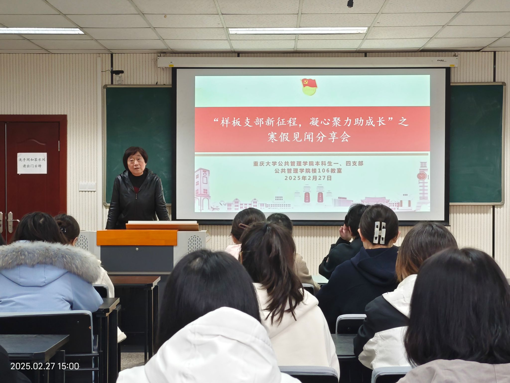 2025-03-032025年2月27日15点,新学期伊始,重庆大学公共管理学院本科生一、四支部,为充分发挥交流分享的积极作用,在学院楼106会议室精心举办了“样板支部新征程,凝心聚力助成长”之“寒假见闻分享会”活动。此次活动旨在为同学们搭建一个交流平台,让大家能够分享寒假期间的丰富经历,开拓视野,锻炼表达与逻辑思维能力,增强团体凝聚力,助力同学们以饱满的精神状态回归学习生活。一、四支部全体党员踊跃参与其中。分享会现场气氛...