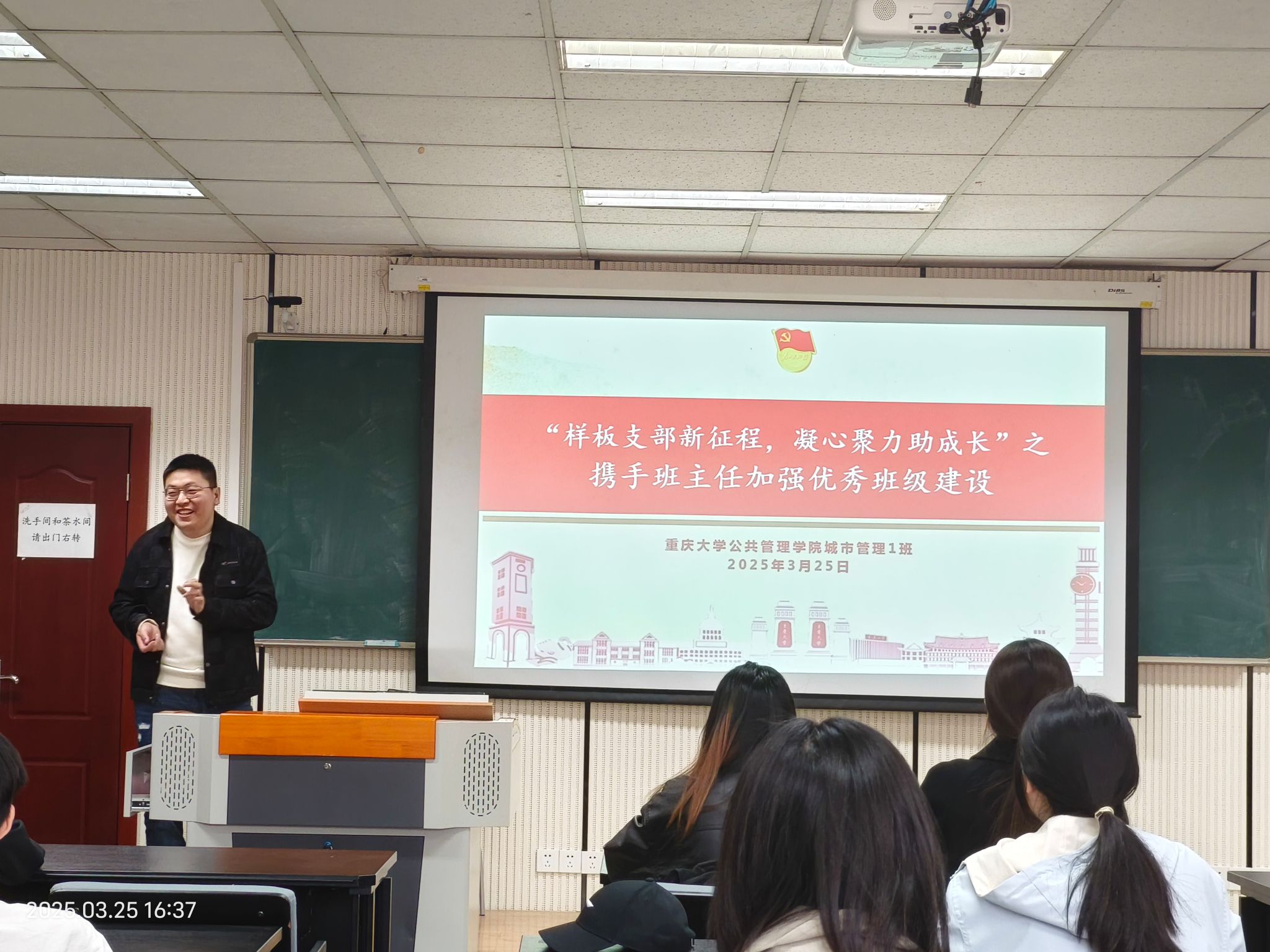 2025年3月25日16:30,重庆大学公共管理学院本科生一四支部在学院楼106教室成功举办“样板支部新征程,凝心聚力助成长”之“携手班主任加强优秀班级建设”活动。本次活动由班主任璩路路、一支部党员刘志兰、罗静共同组织,2022级城市管理1班的全体学生积极参与,旨在帮助学生明确发展方向,科学规划升学就业路径。班会伊始,班主任璩路路对城市管理专业的专业前景进行了分析,并指出在大三下这个关键时期,同学们应该明确自己对...