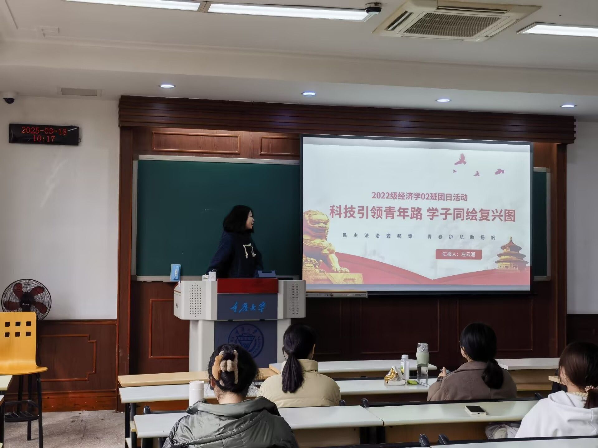 2025-03-24为了增强团员们的法治意识,提升团员青年尊法学法守法用法的能力素养,加深团员对于新质生产力的理解,根据校团委部署,2025年3月18日10点20,重庆大学公共管理学院2022级经济学2班团支部在第五教学楼开展了“科技引领青年路·学子同绘复兴图”主题团日活动。本次活动共包含学习民主法治建设、推动新质生产力发展以及同学讨论发言共三个部分。活动伊始,班级团支部书记左云湘首先向同学们详细讲解了民主法治的相关内容。通过讲解...