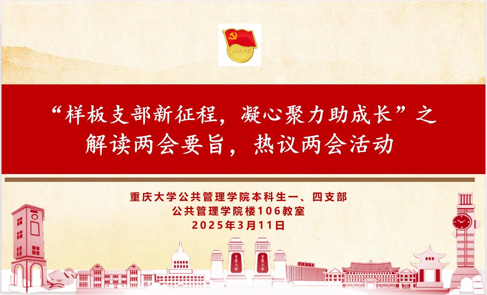 2025-03-11十四届全国人大三次会议于2025年3月5日上午开幕,3月11日下午闭幕;全国政协十四届三次会议于2025年3月4日下午3时在北京开幕,3月10日上午闭幕。3月11日12:40,重庆大学公共管理学院本科生一、四支部在学院楼106教室举行“样板支部新征程,凝心聚力助成长”之解读两会要旨,热议两会活动。一、四支部的全体党员和预备党员们积极参与,并就关心的热点问题进行了深入、热烈的讨论。本次交流活动由一支部书记王丽娟组织,四支部202...