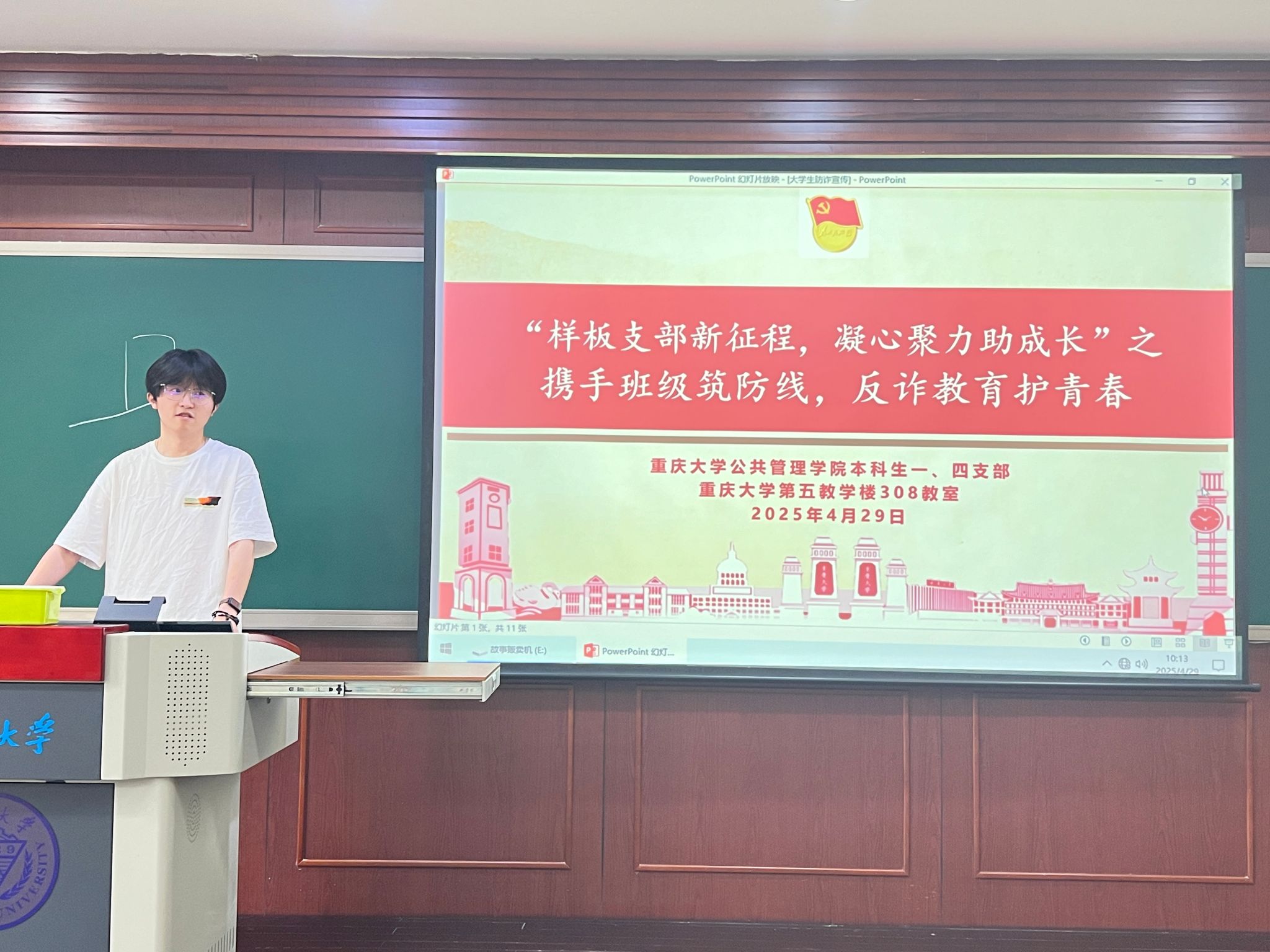 2025-05-092025年4月29日上午十点,重庆大学公共管理学院本科生一、四支部携手经济学01班在第五教学楼308教室展开“样板支部新征程,凝心聚力助成长”之携手班级筑防线,反诈教育护青春主题班会活动。本科生一、四支部的党员、预备党员以及经济学01班的全体成员都积极参与了此次活动。主讲人为经济学01班班长石金阳,现场氛围热烈,反诈知识深入人心。活动伊始,主讲人石金阳通过一组触目惊心的数据敲响了防诈警钟。他提到,仅2024年一年...