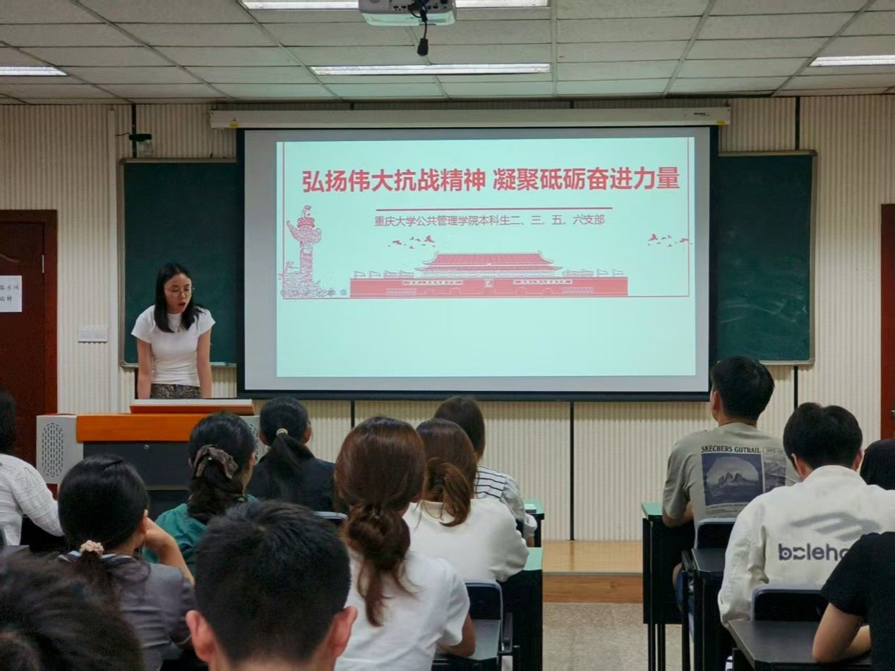 2025-09-222025年9月12日13时,重庆大学公共管理学院本科生二、三、五、六支部于学院106教室,联合开展了以“弘扬伟大抗战精神、凝聚砥砺奋进力量” 为主题的2025-2026学年第一学期“开学第一课”主题党日活动。此次活动由本科生五支部书记曹李思帆同志主持,旨在强化支部成员的理想信念与使命担当。活动伊始,曹李思帆同志带领全体成员回顾了“九三阅兵”的庄严时刻。通过播放阅兵片段,那一幕幕震撼的画面唤醒了同学们对这一国家盛典的...