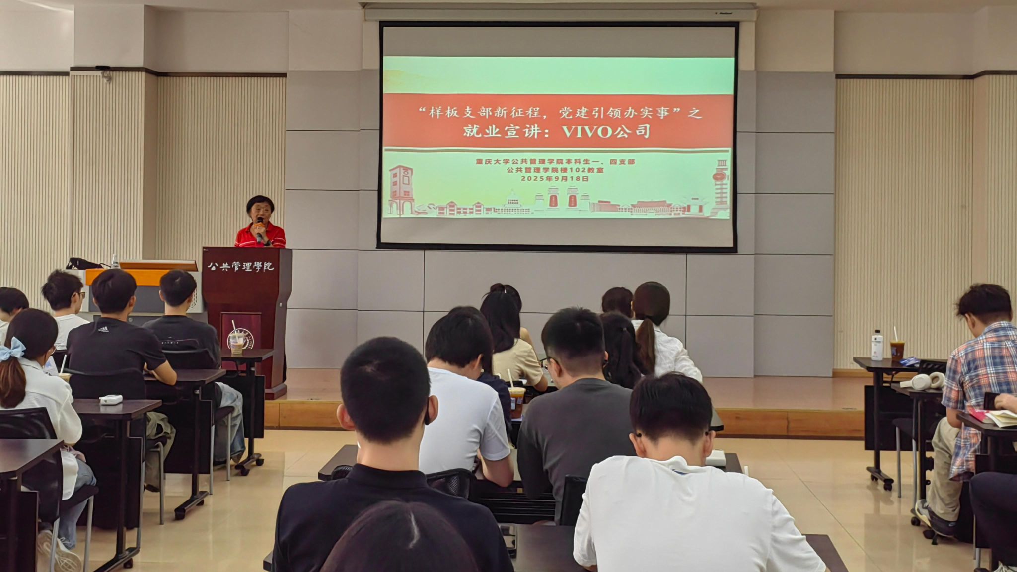 2025-09-222025年9月18日下午15点,公共管理学院本科生一、四支部在学院楼102会议室开展“样板支部新征程,党建引领办实事”就业系列活动之VIVO公司就业宣讲。活动旨在为2026届本科毕业生搭建与优质企业面对面交流的平台,助力学子把握就业机遇。由一支部书记兼2022级本科生辅导员王丽娟牵头,VIVO公司人力资源部负责人主讲,学院全体2026届本科毕业生积极参与。宣讲会现场,VIVO公司人力资源部负责人以“少年有信,志筑未来”为主题,从企...