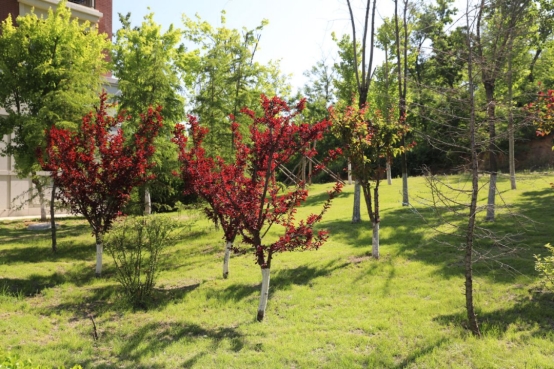 毓秀①通幽,启明②深远,壮阔天高,揽无边春色,众芳妖娆。右坡怒放,左岭松涛。丝雨绵绵,莺飞絮尽,满目驰烟任逸遨。鹰舒翼,瞰校园景致,翠叶丰条。