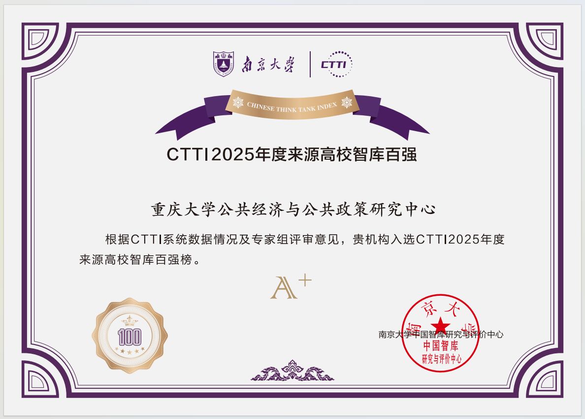 2025-12-16近日,南京大学中国智库研究与评价中心发布了CTTI2025年度来源高校智库百强榜。重庆市人文社会科学重点研究基地——重庆大学公共经济与公共政策研究中心成功入选,位列百强榜A+等级(前40名)。CTTI(中国智库索引)是由南京大学中国智库研究与评价中心联合光明日报智库研究与发布中心共同研发的智库数据管理与评价系统,是我国智库评价领域的权威平台之一。2025年度评选基于智库产品、智库活动、智库媒体影响等客观数据,并...