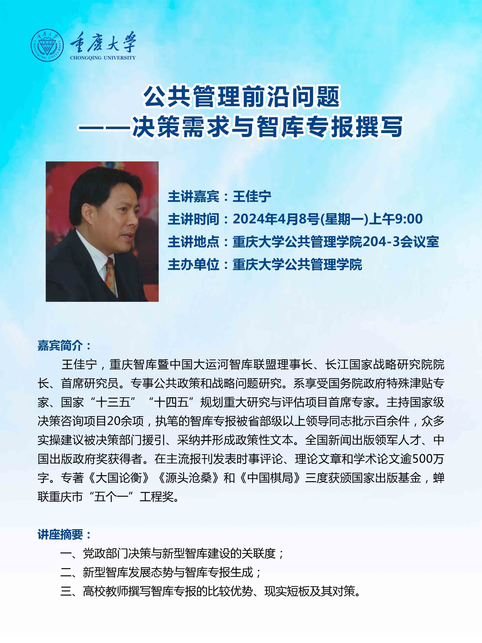 2024-04-232024年4月8日上午9点,重庆智库暨中国大运河智库联盟理事长、长江国家战略研究院院长、首席研究员王佳宁受邀于公共管理学院进行关于决策需求与智库专报撰写的学术讲座,同星空体育 教师、学生就智库专报等相关公共前沿问题的理解与经验进行分享。公共管理学院副院长王辉副教授、学院教师以及相关专业研究生参加座谈,学术讲座由王辉主持。王佳宁从农村三变革实例出发,深入浅出的讲解了智库专报如何服务于中央与地方的决策需求,智库...