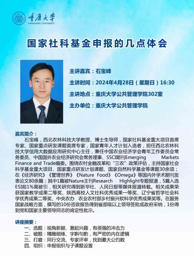 2024-05-272024年4月28日下午16:30,西北农林科技大学教授、博士生导师,国家社科基金重大项目首席专家、国家重点研发课题首席专家,国家青年人才计划入选者石宝峰教授受邀于公共管理学院进行关于国家社科基金申报的几点体会的学术讲座,同星空体育 教师、学生就国家社科基金申报等相关工作的理解与经验进行分享。学院教师及学生参加了讲座,学术讲座由学院副院长王辉主持。石宝峰从自身国家社科基金申报的体会出发,深入浅出地讲解了国家社科...