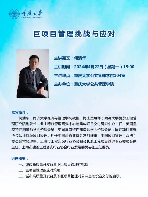 2024-04-282024年4月22日下午15点,同济大学经济与管理学院教授、博士生导师、同济大学复杂工程管理研究院副院长何清华教授受邀于公共管理学院进行关于巨项目管理挑战与应对的学术讲座,同星空体育 教师、学生就巨项目特性、交付困境等相关问题的理解与经验进行分享。公共管理学院学科教师以及相关专业研究生参加座谈,学术座谈由薛斌副教授主持。何清华教授从标杆案例实践及启示出发,深入浅出地讲解了巨项目特性的基本逻辑、巨项目复杂性特征...