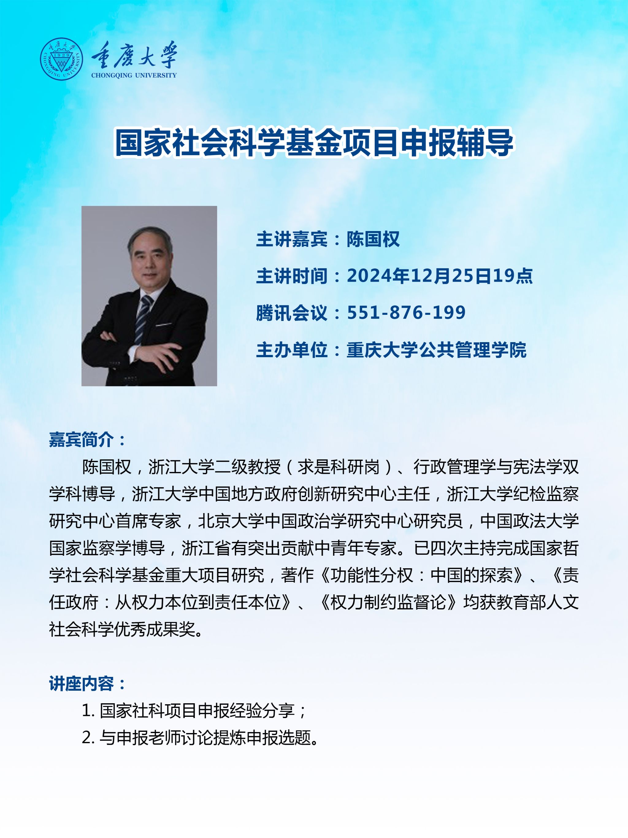 2024年12月25日晚,浙江大学二级教授、北京大学中国政治学研究中心研究员、中国政法大学国家监察学博导、浙江省有突出贡献中青年专家、国家哲学社会科学基金重大项目负责人陈国权教授受邀于公共管理学院通过线上会议的形式进行国家社会科学基金项目申报辅导的学术讲座,同星空体育 教师进行分享。学术讲座由学院副院长王辉主持。陈国权首先进行了国家社科项目申报的经验分享,分别从研究问题的选择、学术史的编写、研究方法与技术路...