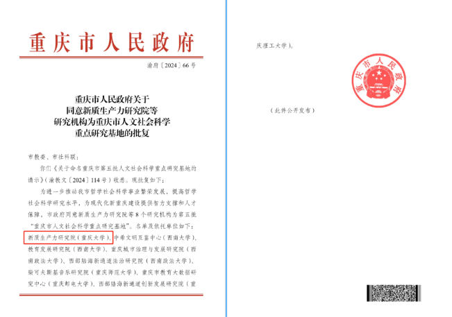 2024-09-06重庆大学公共管理学院喜获重庆市政府批准的重庆市哲学社会科学重点研究院——新质生产力研究院,该研究院是重庆地区首个以新质生产力命名的省级重点研究机构。研究院旨在服务国家新质生产力战略,助力重庆培育新质生产力,同时为学校的学科发展注入新动力。未来新质生产力研究院将聚焦三大研究方向:一是构建重庆现代化产业体系因地制宜发展新质生产力;二是数字创新推动新质生产力;三是新质生产力政策创新与现代化治理体系。...