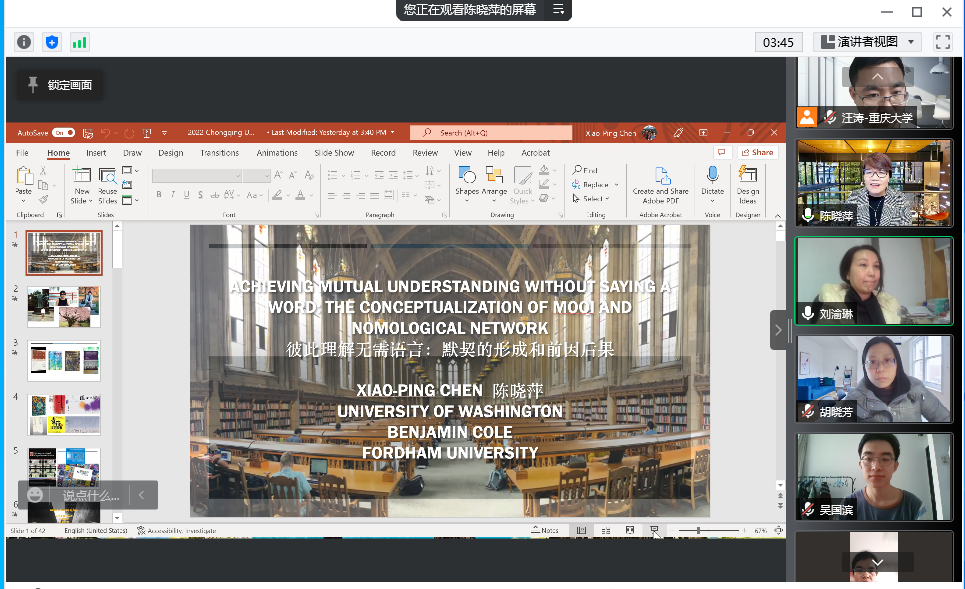 为了进一步开阔师生的视野,发掘学术兴趣,启发科研思路,2022年3月4日上午10点,重庆大学公共管理学院举办了以《彼此理解勿需语言:默契形成的前因后果》为主题、以腾讯会议为依托的线上讲座。本次讲座的主讲人是美国伊利诺大学工业和组织心理学博士、美国管理学会院士、美国心理学会院士陈晓萍教授。讲座由公共管理学院副院长刘渝琳教授主持。陈晓萍潜心于教学研究,曾任美国华盛顿大学福斯特商学院副院长和组织管理学主任,...