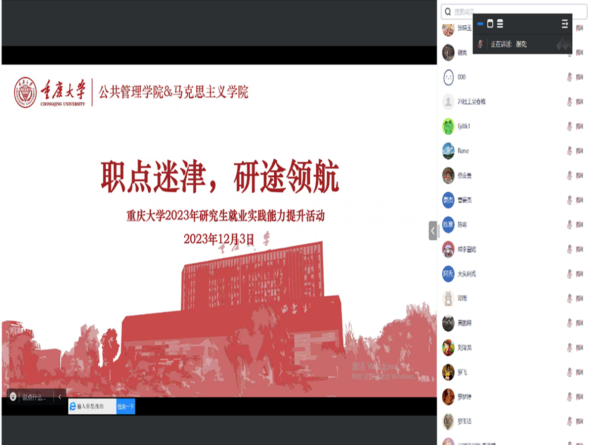 2023-12-212023年12月3日15:00,由公共管理学院、马克思主义学院两学院研究生团委学生会联合举办的“职点迷津,研途领航”研究生就业实践能力提升交流会于腾讯会议线上顺利开展。