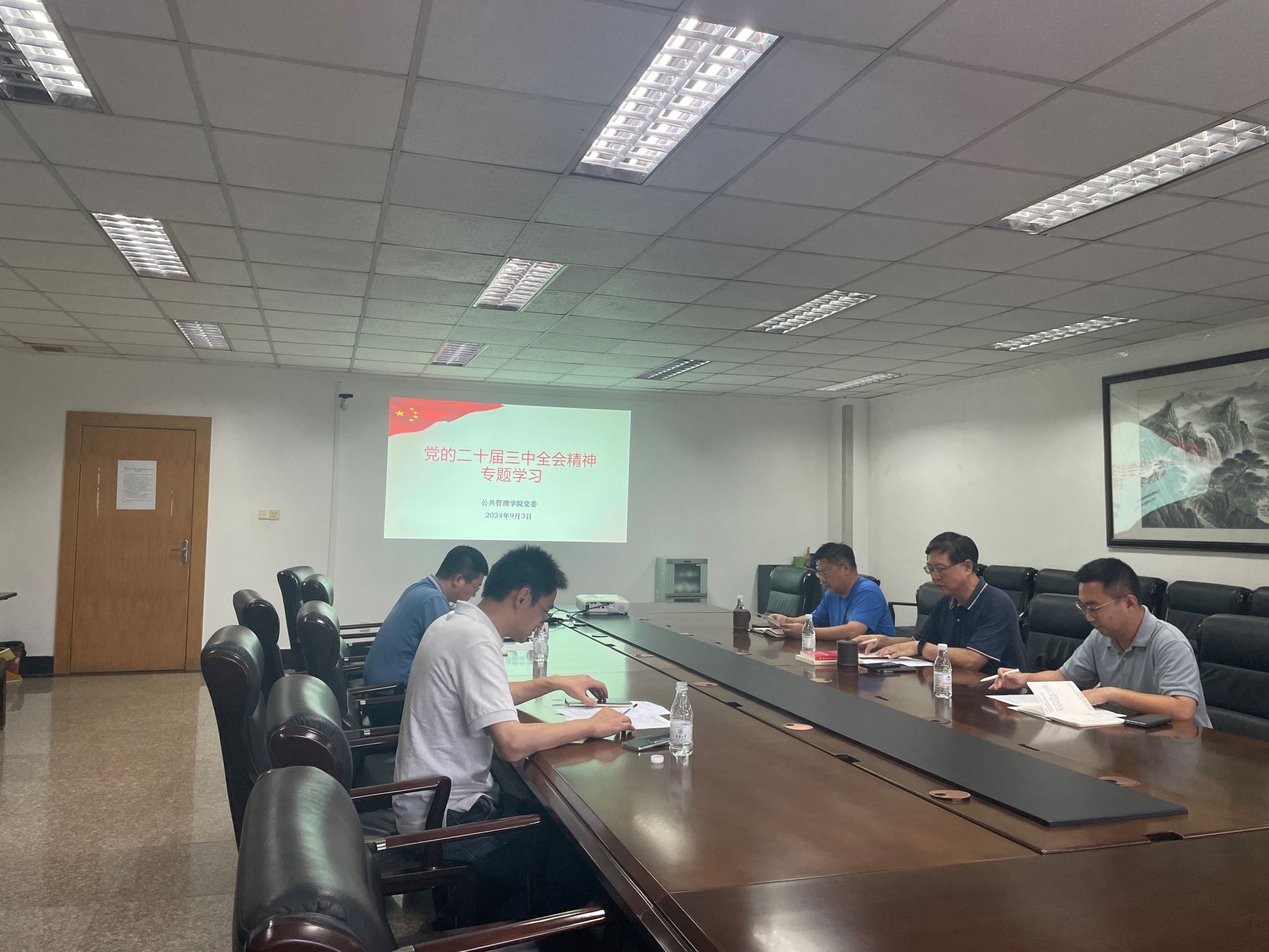 2024-09-07 9月3日下午,公共管理学院党委在一会议室召开理论学习中心组学习会议,专题学习党的二十届三中全会精神。党委书记陈东主持会议并作领学发言。中心组其他成员参加学习并作交流发言。 陈东指出,党的二十届三中全会是在以中国式现代化全面推进强国建设、民族复兴伟业的关键时期召开的一次十分重要的会议。习近平总书记在党的二十届三中全会上的重要讲话和全会通过的《决定》,深刻回答了在新的历史条件下举什么旗、...
