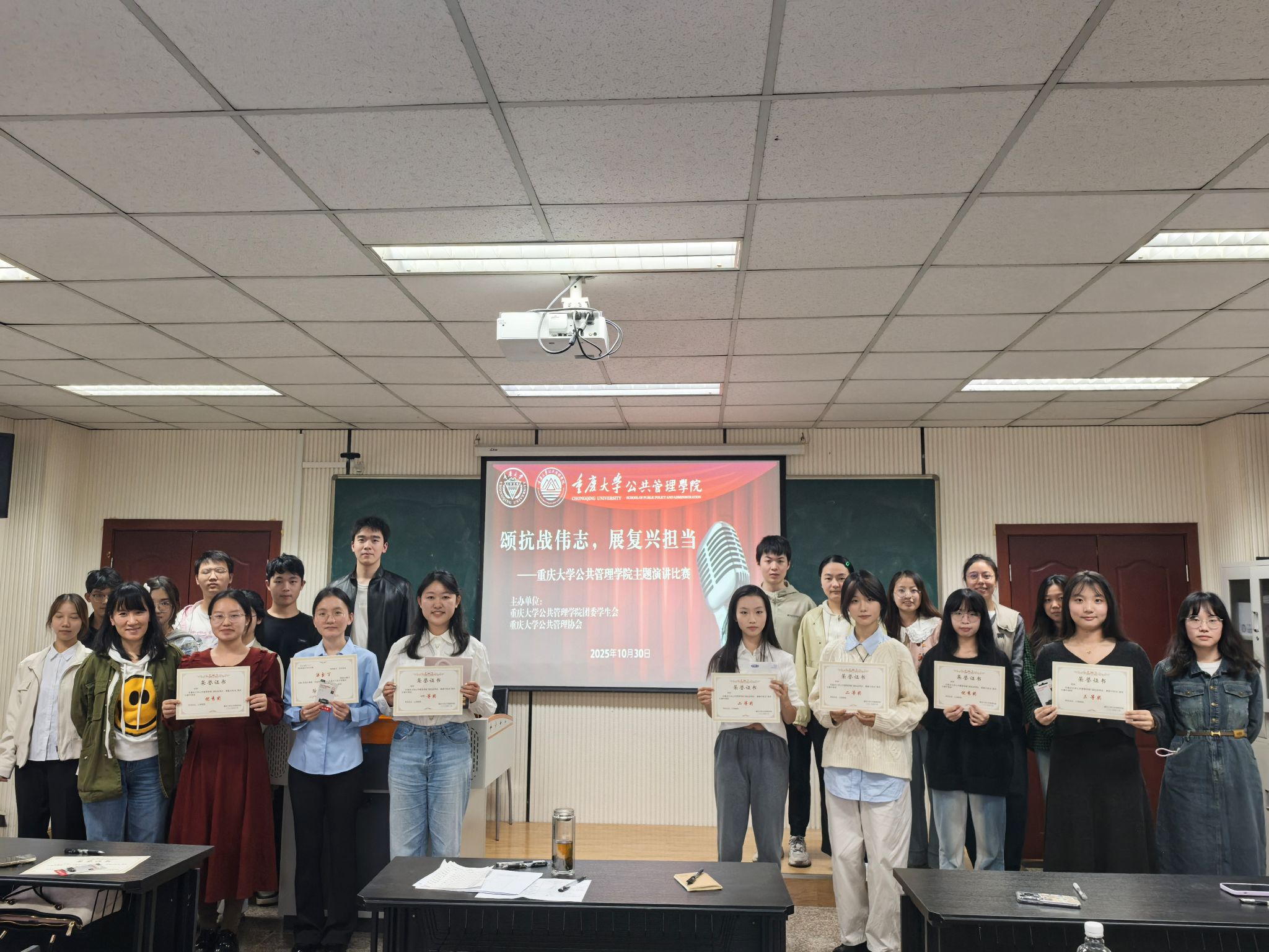 2025-11-10为深入学习贯彻习近平总书记关于传承和弘扬伟大抗战精神的重要论述,激励广大青年学生铭记抗战历史、厚植爱国情怀,2025年10月30日,公共管理学院团委学生会联合公共管理协会面向重庆大学全体本科生成功举办了2025年“颂抗战伟志,展复兴担当”演讲比赛。比赛吸引了来自美视电影学院、艺术学院和新闻学院等学院的选手积极参赛,学院团委书记兼2024级辅导员徐柳老师、2023级辅导员李庆老师以及4名硕士研究生代表担任本次比赛的评...