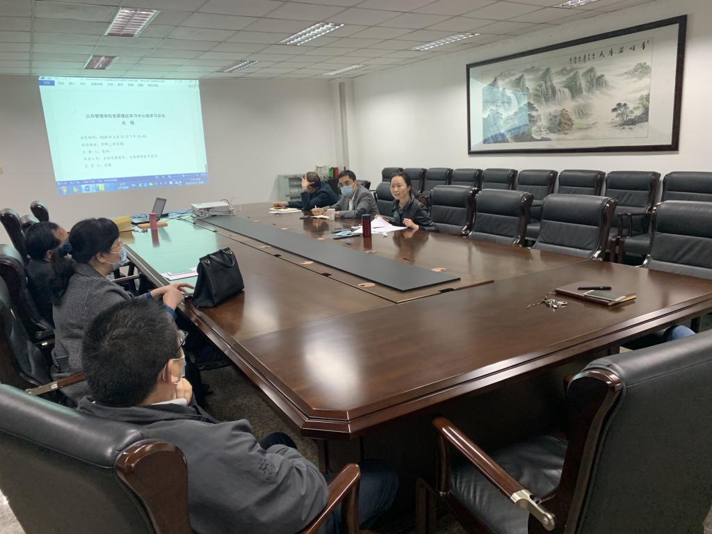 2020-04-274月21日下午,公共管理学院党委理论学习中心组学习暨党委工作会在学院一会议室召开,学院党委书记张玲主持会议,全体党委委员、领导班子成员参加本次会议。会上,张玲向与会同志就学院近期情况作了通报。对2019年度绩效考核及结算情况作了报告。对学院2020年度重点工作做了安排。她指出,希望各位党委委员、领导班子成员通力合作,以党建促发展,做好分管领域的工作,促进学院年度重点工作的完成。党委副书记、纪委书记袁晓浩...