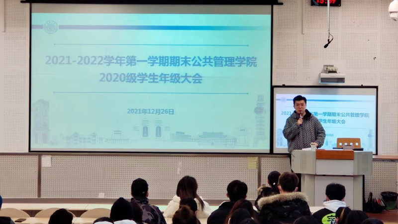 2021-12-29在本学期进入尾声之际,为帮助同学们总结学期生活,并更好地迎接考试周和即将到来的寒假,2021年12月26日下午,公共管理学院在虎溪校区D1237教室召开2020级学生年级大会,会议由2020级辅导员包晗主持,2020级全体同学参加。会议指出,当前国内疫情形势十分严峻复杂,现在又正处于两节三夜和寒假的交集,同学们应主动做到“非必要不外出”,离校离渝事项要提前主动报告,确有外出必要时,严格执行请销假手续并做好个人防护。而针...