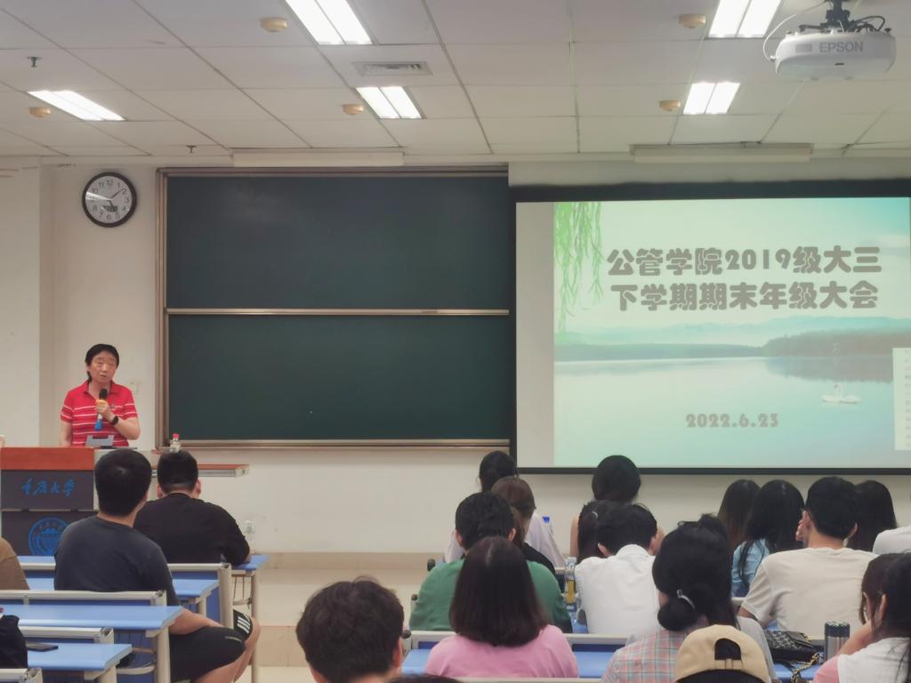 2022-06-242022年6月23日下午五点,学院2019级大三下学期期末年级大会于主教107顺利开展。会议主要围绕学期总结、小学期教学安排、暑期注意事项及大四上学期相关事宜展开。本次会议由学办主任、19级辅导员王丽娟主持,19级全体同学到会。会议伊始,王老师首先对本学期的学生工作进行了回顾。本学期由于已是大三下学期,年级活动有所减少,学院支持同学们将更多时间用于课程学习、提升绩点以及为升学就业作准备。但是对于阳光60分等健康向...