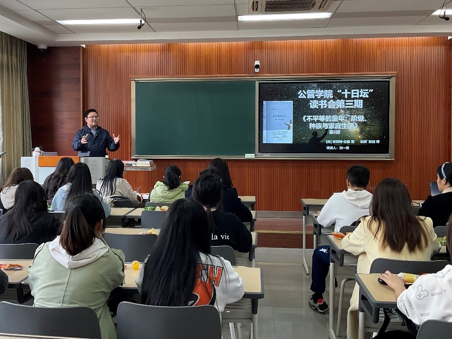 2022-10-13为了搭建思想交流平台,营造阅读经典的氛围并培养学生的学科意识与兴趣,由公管学院公共人力与社会保障系师生共同举办的读书会于2023年3月30日下午2点30分在虎溪校区D1328教室如期举行。本次读书会是继《穷人的银行家》以及《金翼》之后,首次以线下方式举行,由刘一笑老师领读安妮特·拉鲁所作的《不平等的童年:阶级、种族与家庭生活》。读书会吸引了来自公管学院、本科生院、经管学院、管科学院以及外国语学院等多个学院的30...