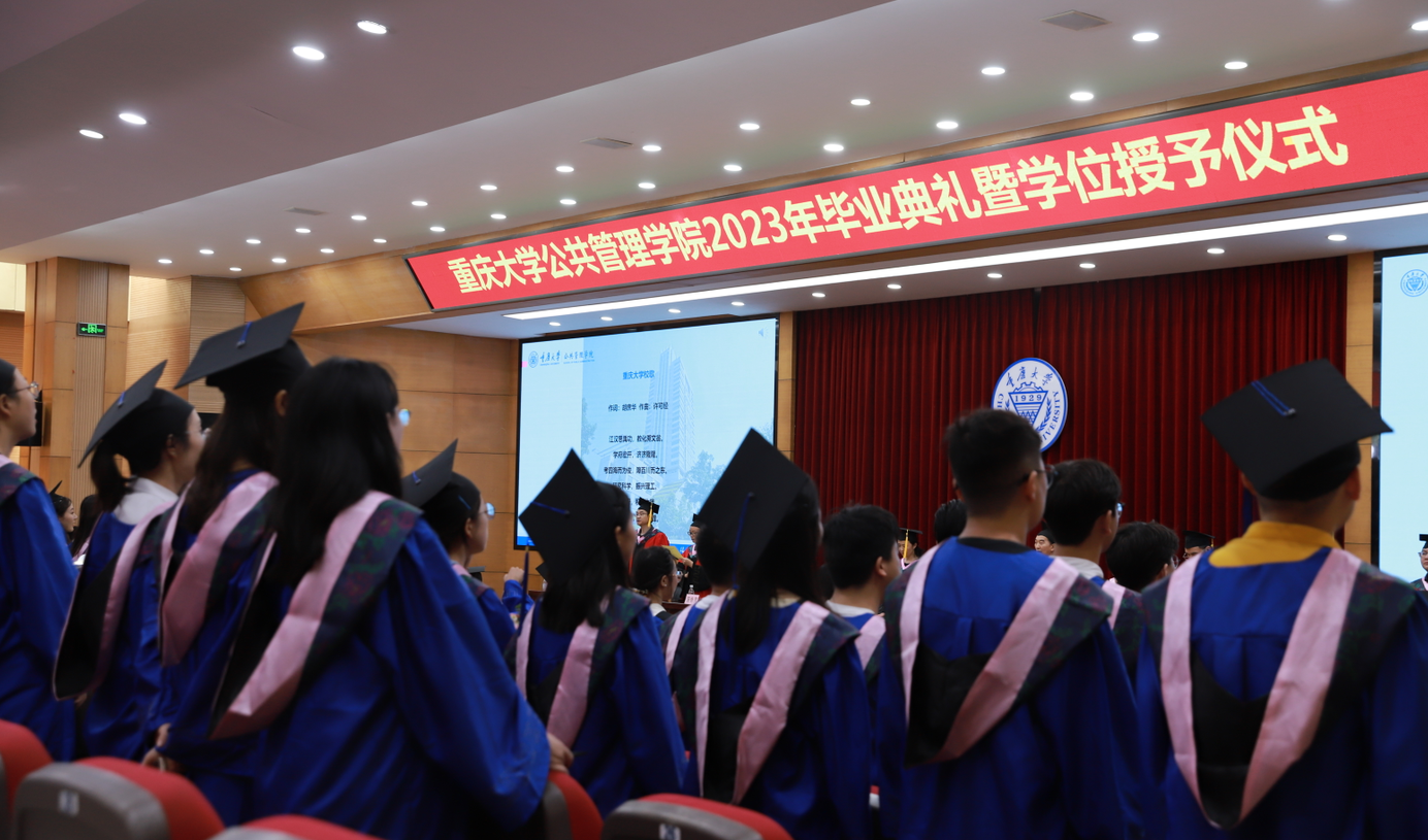 2023-07-192023年6月28日上午,重庆大学公共管理学院2023年毕业典礼暨学位授予仪式在A区民主湖报告厅举行。公共管理学院党委书记张玲、院长刘炳胜等班子成员出席,学位评定分委员会委员、教师代表和全体2023届毕业生共400余人参加。典礼由学院党委副书记袁晓浩主持。典礼会场后方悬挂标语:“奋斗新时代、奋进新征程,努力成为有理想、敢担当、能吃苦、肯奋斗的新时代好青年!”饱含了学院对毕业学子的殷殷期望。入场前,全体毕业生和教师...